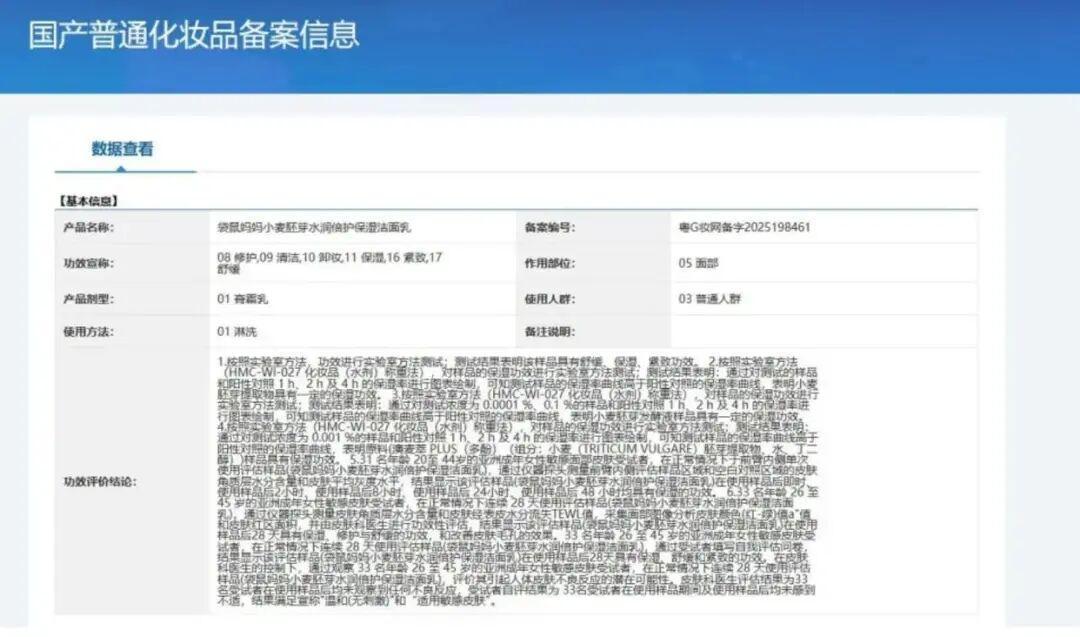 以袋鼠妈妈主推的小麦礼盒系列产品为例,产品包括小麦胚芽水润倍护柔肤水、保湿乳、洁面乳等,其页面详情宣称“准孕妇第一套护肤品”“只为准孕妇安心”。但有媒体查询国产普通化妆品备案信息发现,上述产品备案编号均明确显示为国产普通化妆品,使用人群一栏标注为“03普通人群”,并无任何“孕妇”“备孕人群”相关标注。